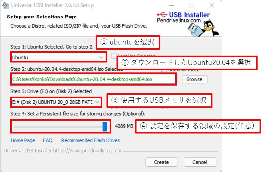 Createを選択すると、Ubuntu起動用USBメモリの作成が開始します。しばらく待っていれば終了します。