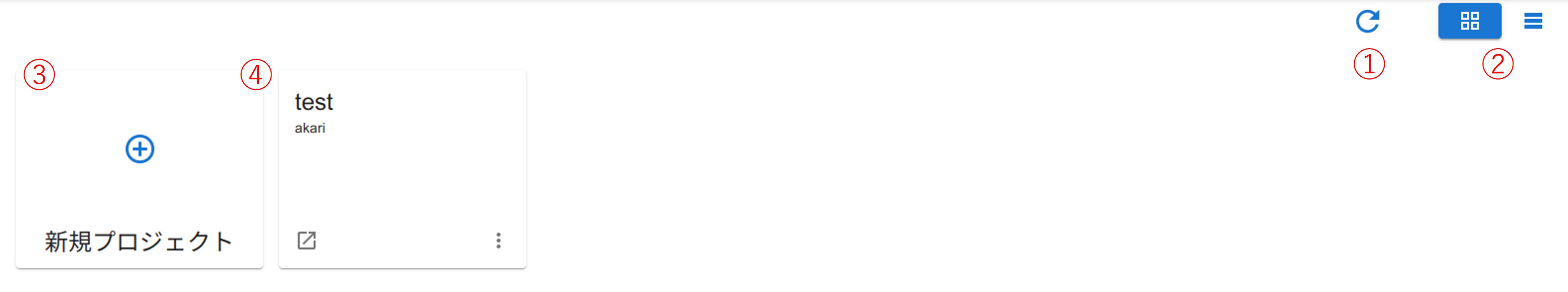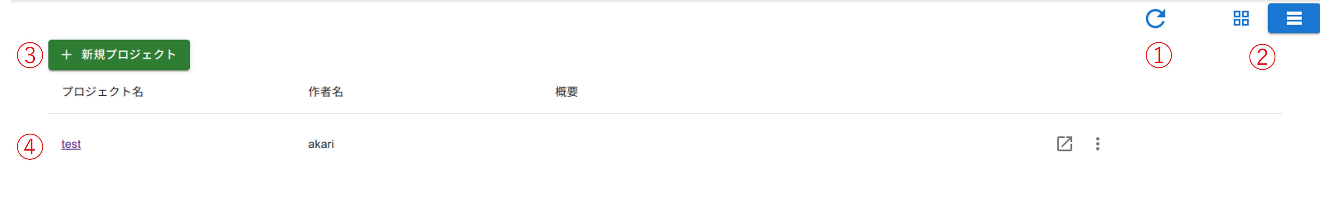 プロジェクトの一覧が表示されます。プロジェクト名を選択すると、プロジェクトが開きます。各プロジェクトには下記の項目があります。・プロジェクト名プロジェクトの名前です。・作者名作者の名前です。・概要プロジェクトの概要です。・その他ボタン現時点では機能未実装です。