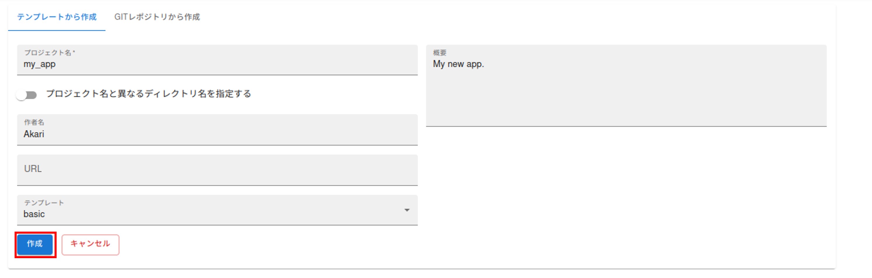 新たにプロジェクト作成用のページが開くので、必要な情報を編集してきます。プロジェクトの作成方法には、 テンプレートから作成 と GITレポジトリから作成 があります。ただしGITレポジトリから作成は現在未実装です。今回は テンプレートから作成 を選択し、下記情報を記入します。プロジェクト名: 好きな名前を入れます。作者名: 任意で作者名を記載します。空欄でも問題ありません。URL:Git公開機能が実装時には、このURLを使って公開しますが、現時点では未実装なので空欄にしてください。テンプレート: プロジェクトのテンプレートスタイルです。今回はBASICを選択してください。概要: 任意でプロジェクトの概要を入れます。空欄でも問題ありません。