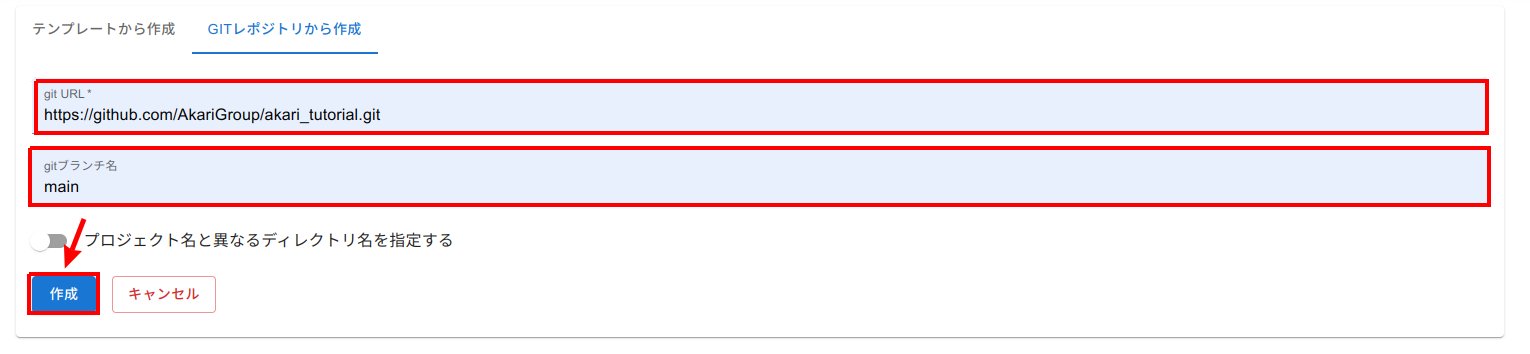 akarai_tutorialのcloneに必要な情報を入力し、作成ボタンを押します。gitブランチ名: main