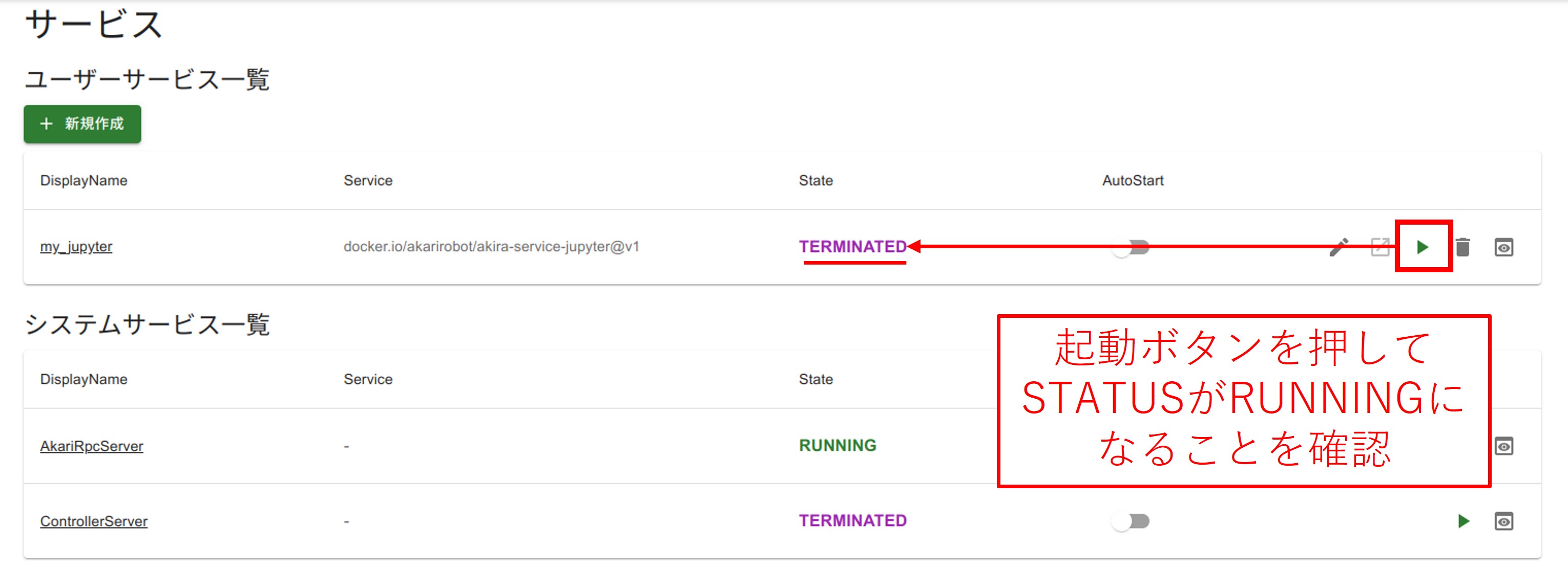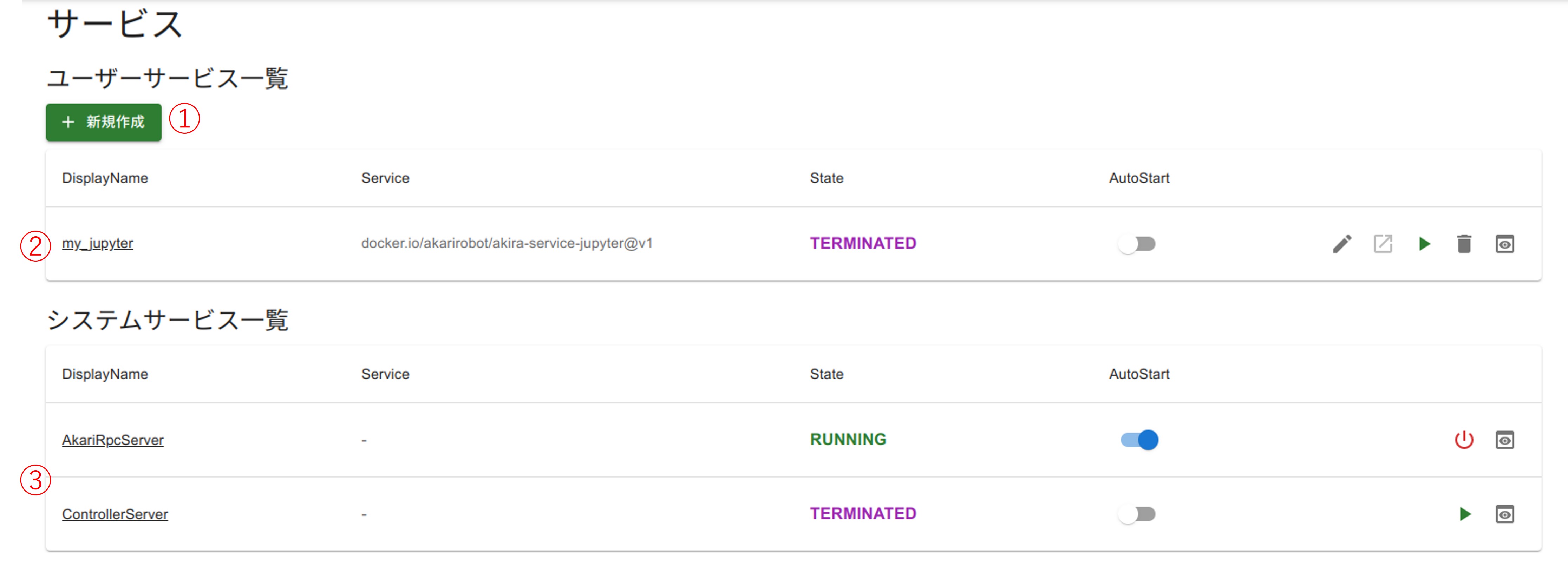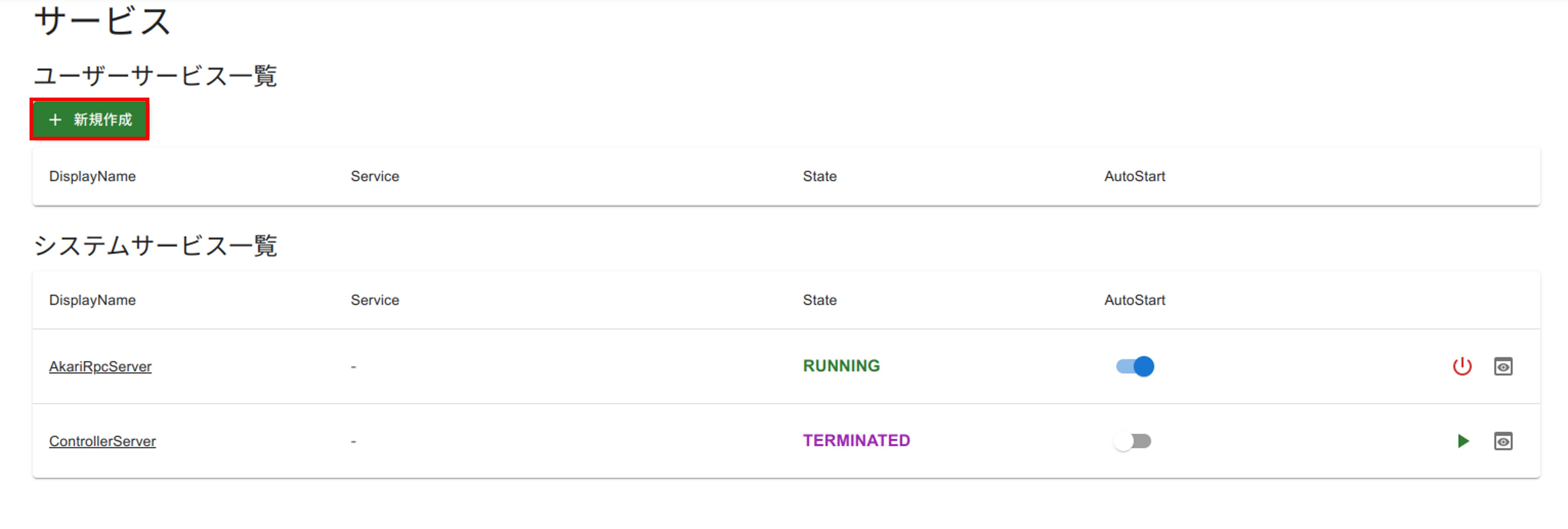 ユーザーサービスの一覧が表示されます。各サービスには下記の項目があります。・DisplayNameサービス名です。・Serviceサービスのベースとなるイメージです。・Statusサービスの状態です。・AutoStartサービスの自動起動の設定です。これをONにしておくと、次回からAKARIが立ち上がった時点でこのサービスも自動で起動します。・編集ボタンサービスの編集ができます。・開くボタンサービスが開きます。・実行・停止ボタンサービスの実行、停止ができます。・削除ボタンサービスを削除できます。・詳細ボタンサービスの状態やエラーメッセージを確認できます。
