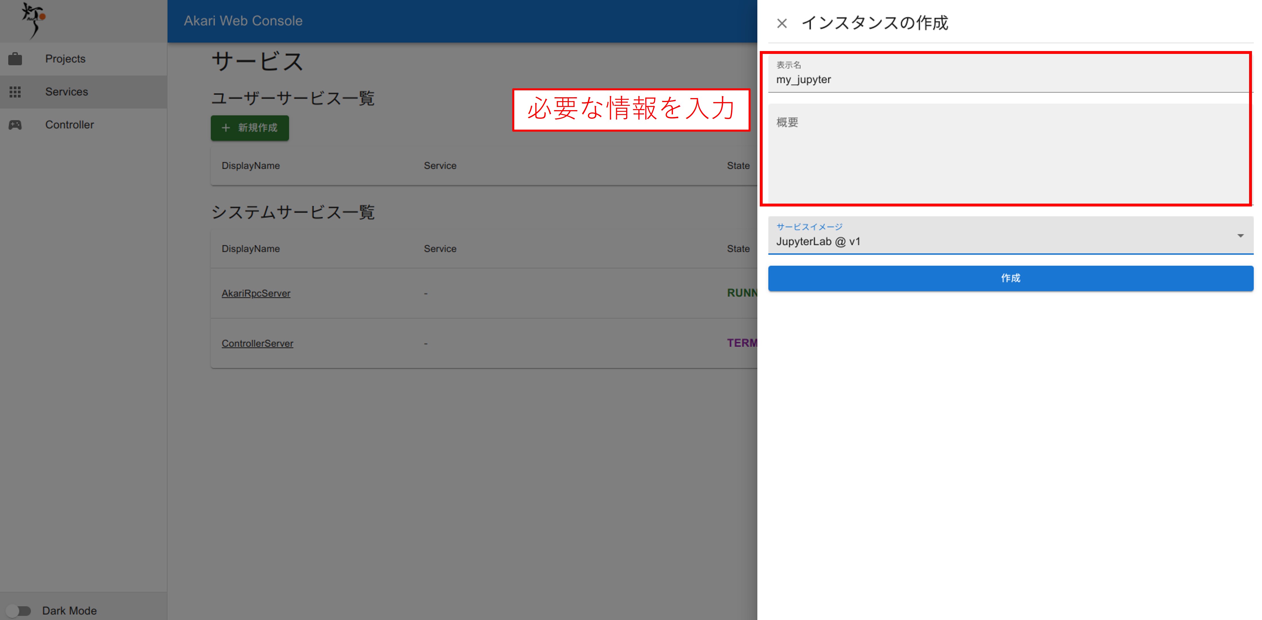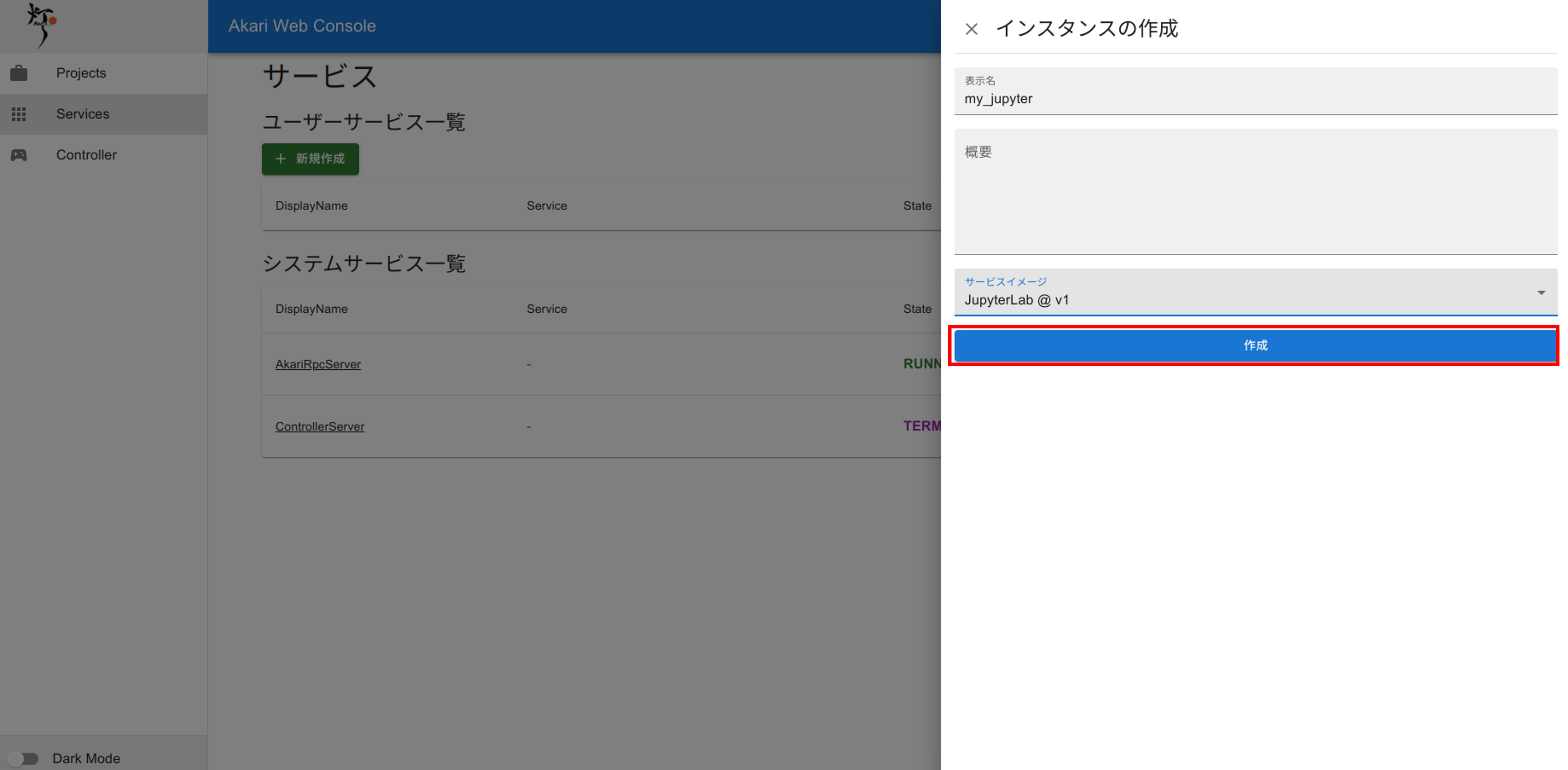 ここでAKARIのサービスを新たに作成できます。